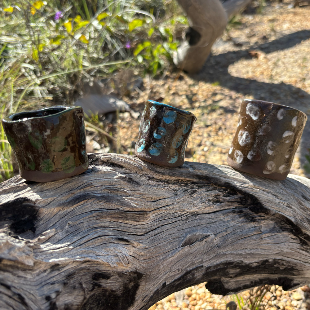 CONJUNTITO DE CAFÉ | COM MINI XÍCARA, COPINHO DE SHOT PARA LEITE E COPINHO PARA ÁGUA COM GÁS | FEITO DE CERÂMICA | ARGILA VESÚVIO | VIDRADO | PINTADO À MÃO | 3 PEÇAS COM DISTINTAS COM APROXIMADAMENTE 8 CM ALTURA E 4 CM DE DIÂMETRO CADA